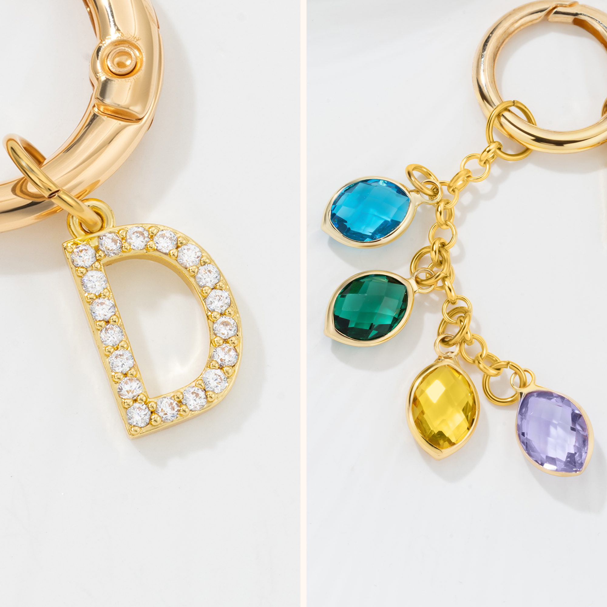Custom Birthstones & Initial - Designed to hold 1–6 birthstones, this piece allows each stone to represent a child or loved one, finished with a cubic zirconia initial for a truly personal touch. The thoughtful customization turns everyday accessories into lasting keepsakes.